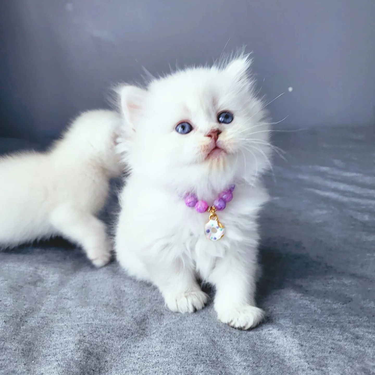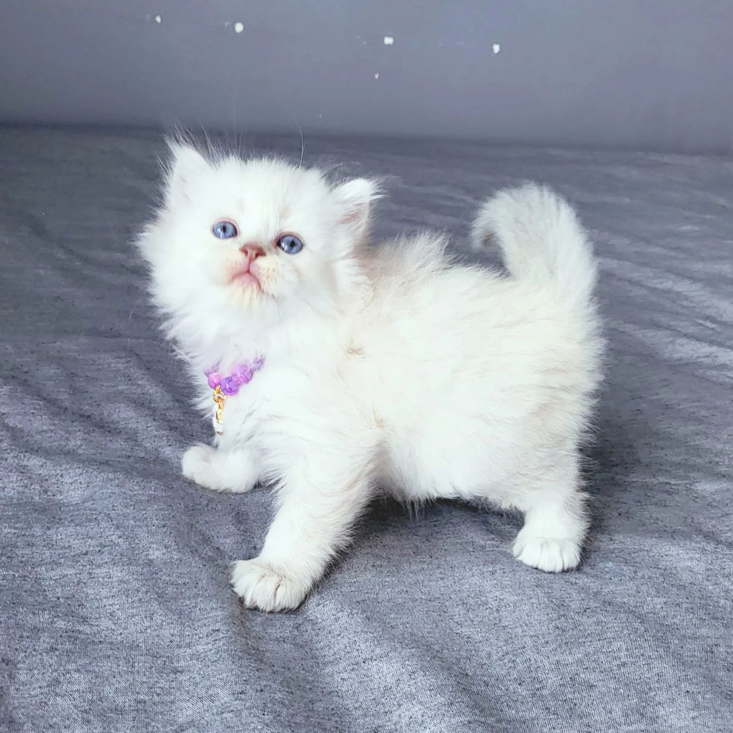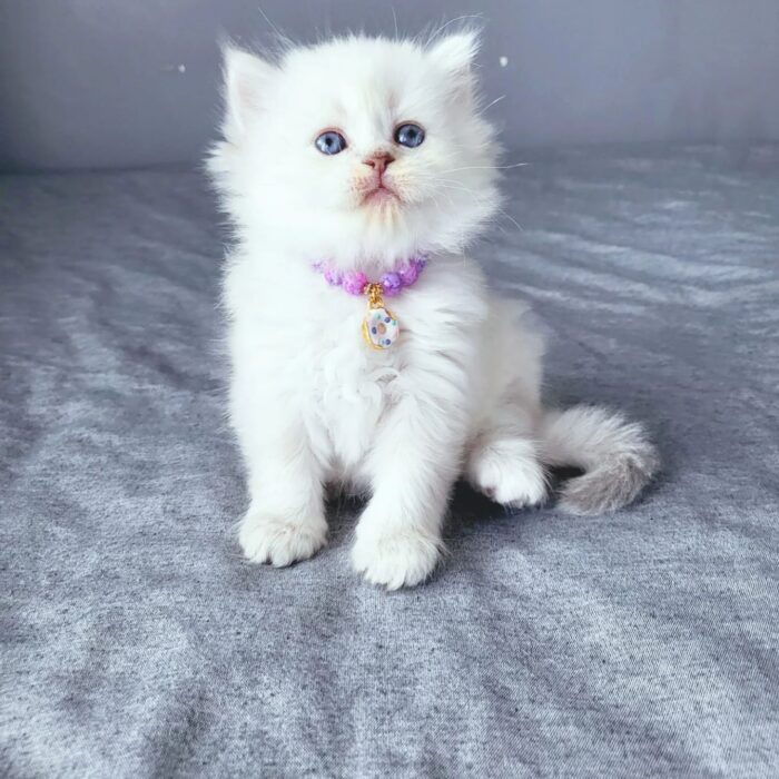 Introducing the BeBe Scottish Fold kitten, a breathtaking female with a plush white coat, folded ears, and mesmerizing blue eyes. Her gentle personality and graceful charm make her the perfect feline companion for anyone seeking love, warmth, and serenity in their home.