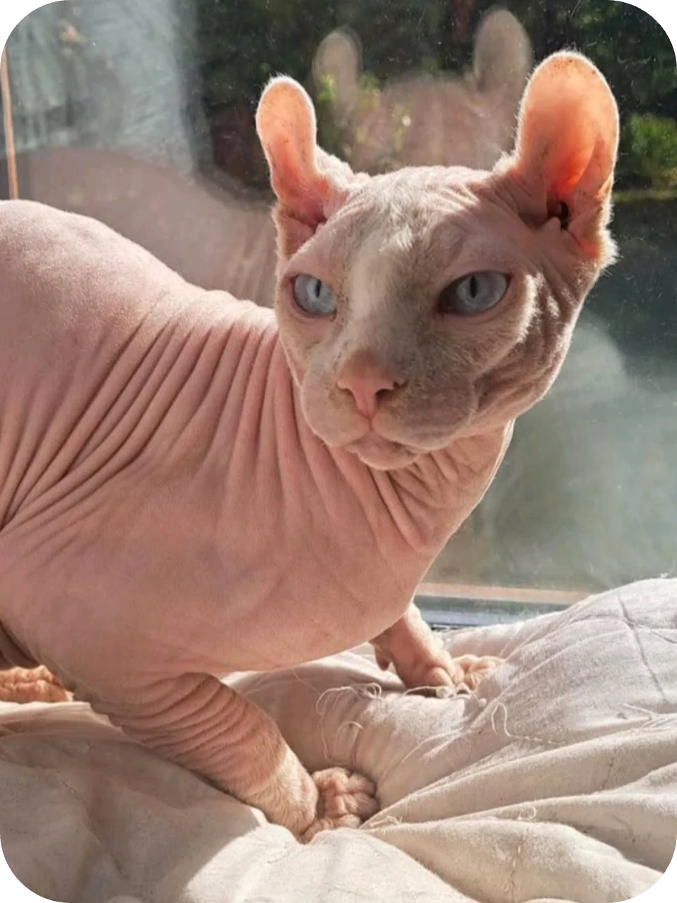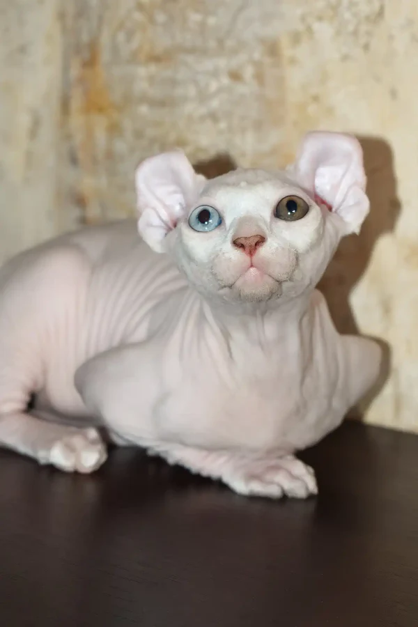 Cecilia is an 11-week-old Elf Sphynx female kitten whose flawless white coat, curled ears, and mesmerizing odd-colored eyes make her a rare and unforgettable beauty. Cecilia Elf Sphynx Female Kitten For Sale is exotic, hypoallergenic, and the perfect blend of elegance and playfulness. Whether she’s curled beside you or chasing shadows across the room, she brings love, laughter, and a touch of magic into your home.