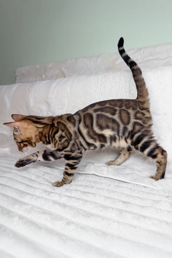 Mango is a breathtaking brown spotted tabby Bengal, his coat a glowing tapestry of golden tones, high contrast, and natural symmetry that makes him stand out even among premium Bengals. When the light touches him, his coat sparkles with the soft shimmer of a Glitter Bengal kitten UK—a subtle magical gleam that dances with every playful step he takes. And then there are his green eyes: expressive, bright, and endlessly curious, the kind of eyes that feel like they truly see you.
