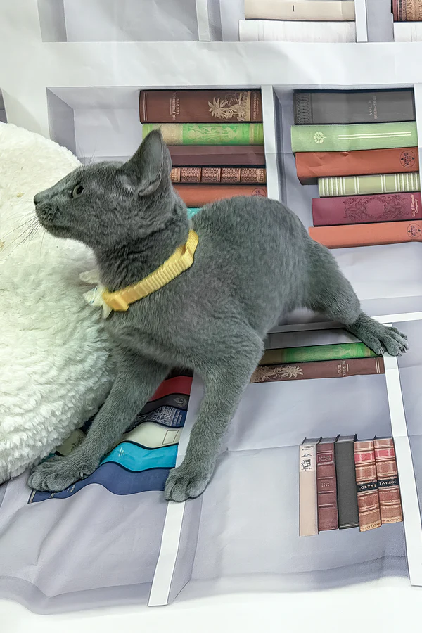 Nikita is a 3-month-old Russian Blue male kitten with a plush blue coat, a soft fluffy undercoat, and a firm, silvery topcoat that glows in the light. His striking green eyes hold a quiet depth, as if he already knows you. Nikita Russian Blue Male Kitten For Sale is calm, observant, and grounded—more likely to sit beside you in quiet companionship than bounce off the walls.