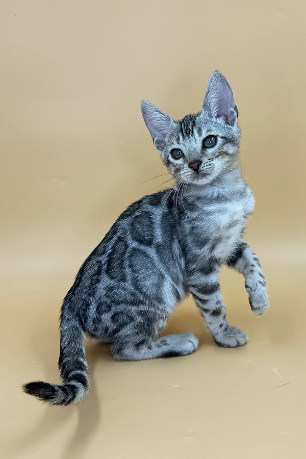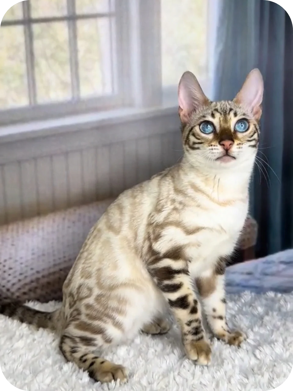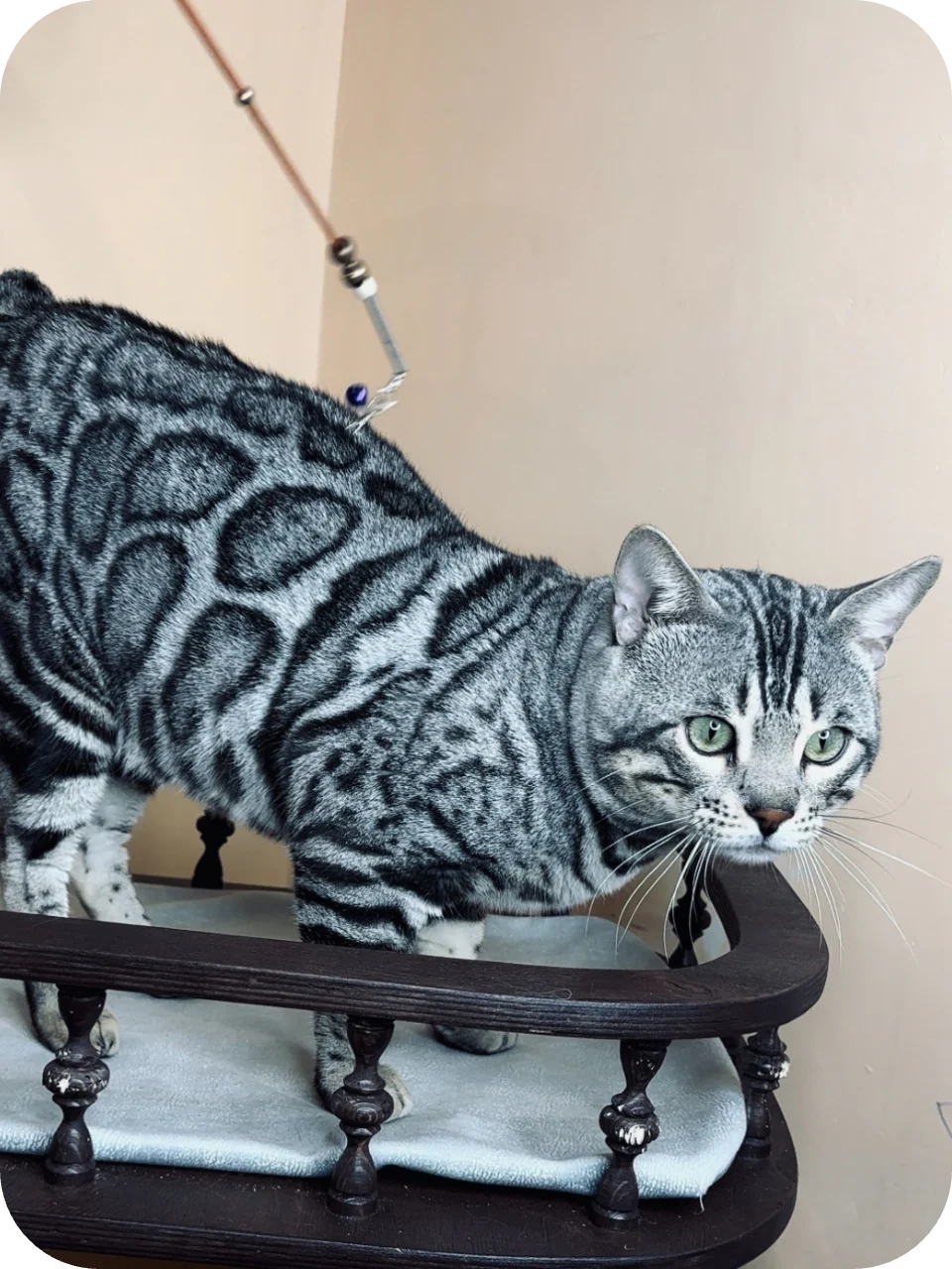 With a cool-to-the-touch silver spotted coat and vivid green eyes framed by bright sockets, Yogi is a Bengal boy who moves like poetry. His long, athletic body glides through hallways and leaps up cat trees with quiet precision. He’s playful, affectionate, and thrives on gentle structure — a kitten who learns fast, bonds deeply, and brings joy to every corner of your home.